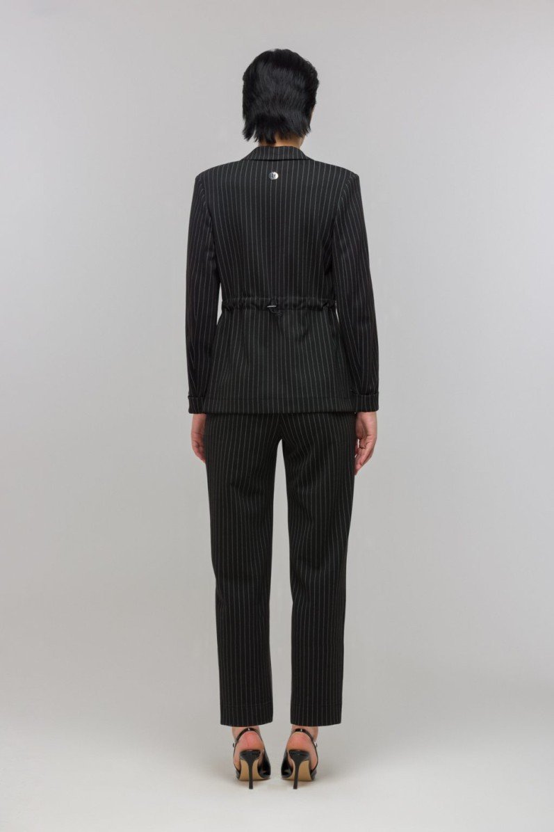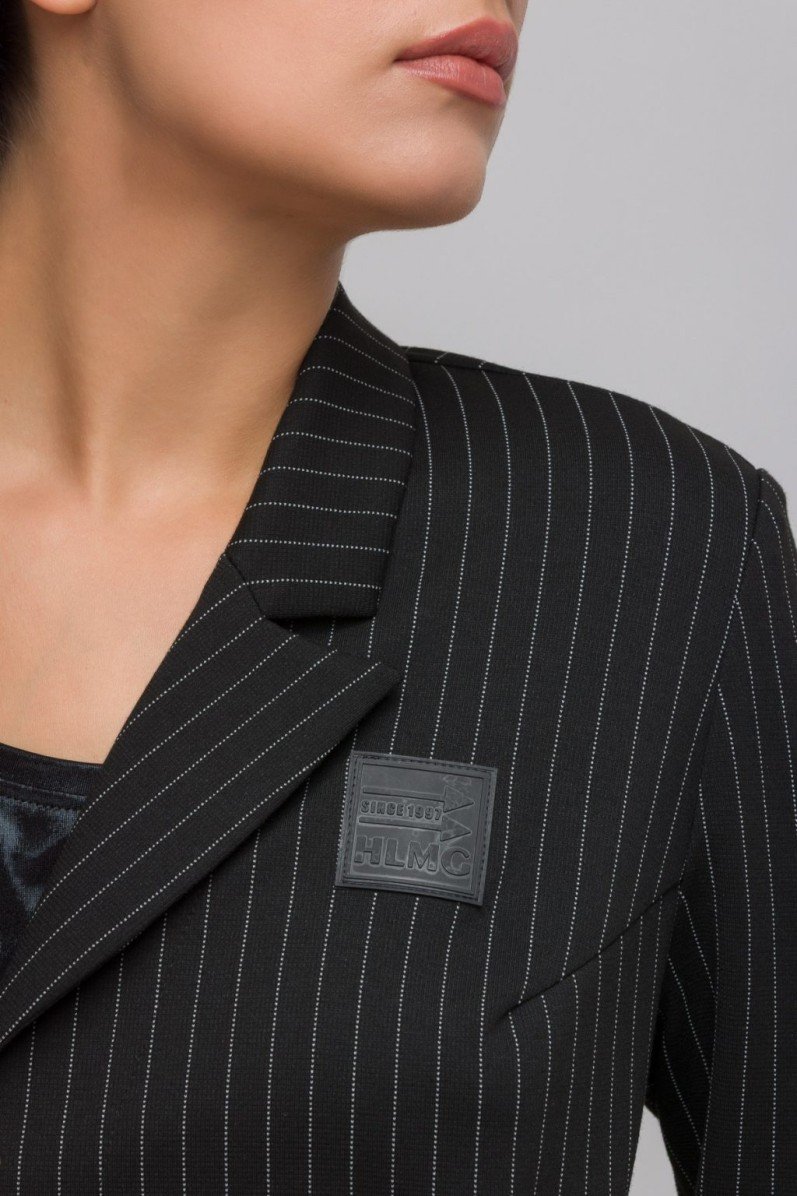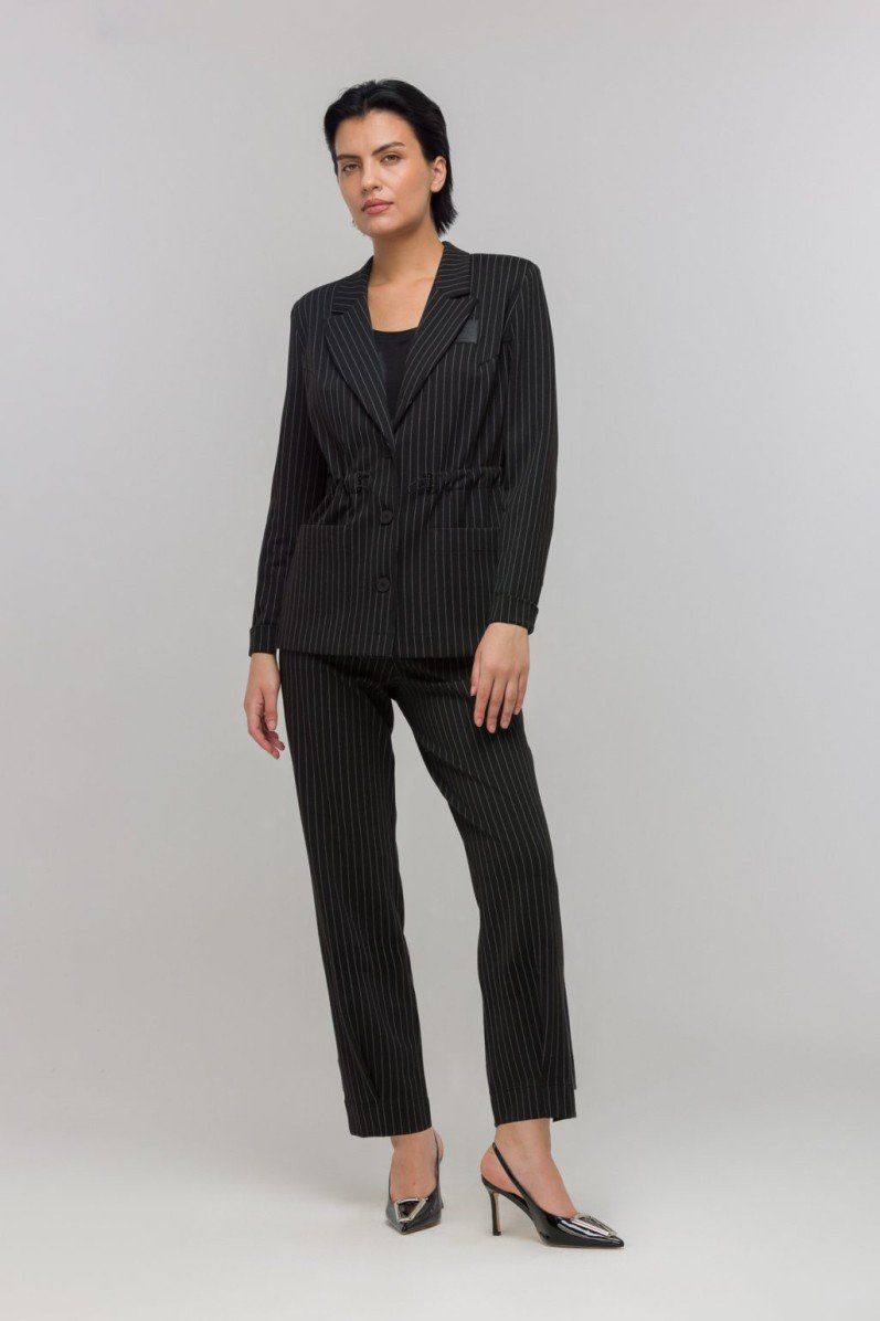 Однобортный прямой жакет в полоску из костюмного трикотажа — современное решение для стильного гардероба. Модель выполнена без подкладки и на подплечниках, что обеспечивает лёгкость и чёткую посадку. Классический английский воротник дополняется застёжкой на пуговицы и двумя удобными накладными карманами. Особое внимание привлекает регулируемая кулиска на талии, позволяющая легко менять силуэт по настроению — от прямого до более приталенного. Декоративная брошь завершает образ, добавляя изысканный акцент. Такой жакет станет универсальной основой для деловых и повседневных комплектов.